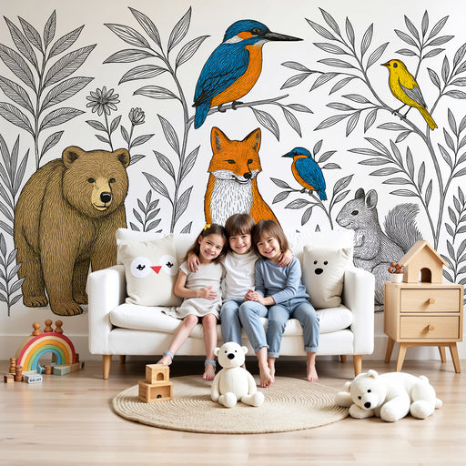KidsWallEmmenez votre enfant dans un voyage fascinant au cœur de la nature avec ce papier peint pour enfants illustrant des animaux emblématiques de la for...