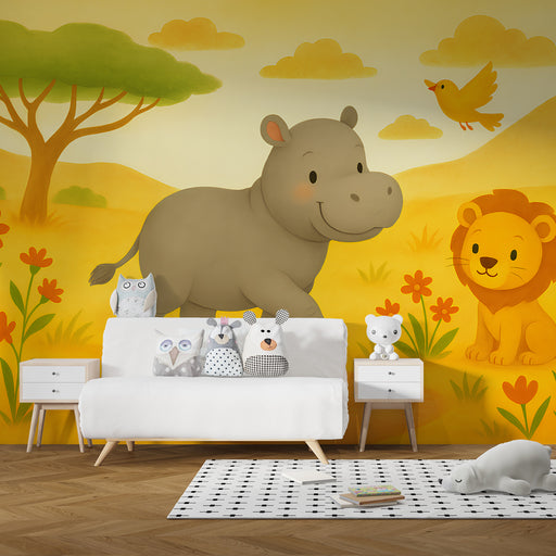 KidsWallTransformez la chambre de votre enfant en un véritable safari avec ce papier peint pour enfants illustrant un hippopotame joyeux et un lion curieux...