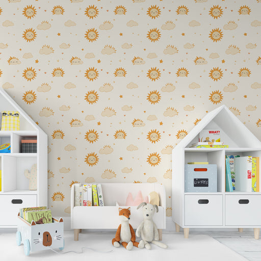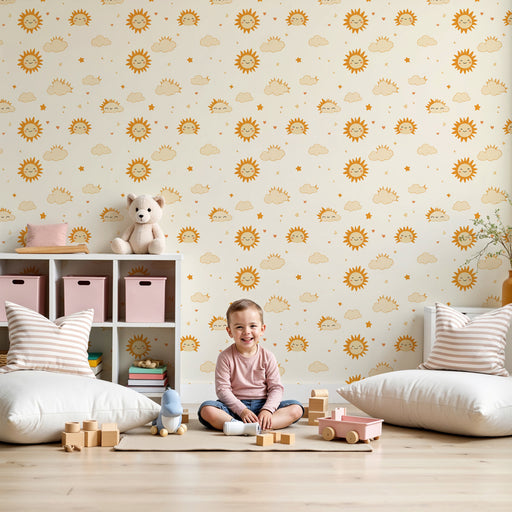 KidsWallAjoutez une touche de chaleur et de joie à la chambre de votre enfant avec ce papier peint adorable, orné de soleils souriants et de nuages feutrés...