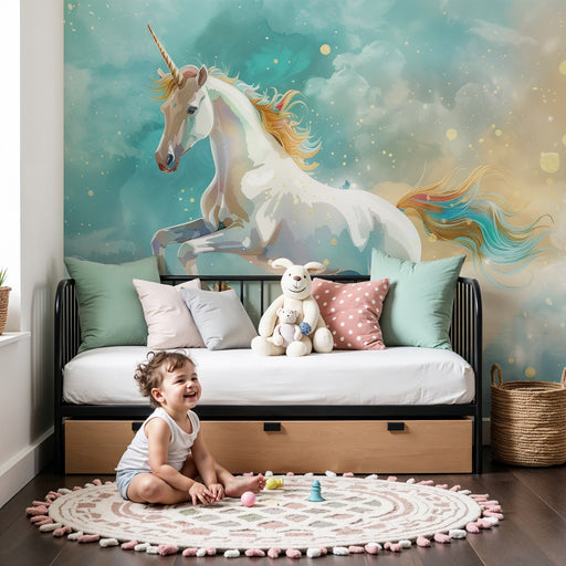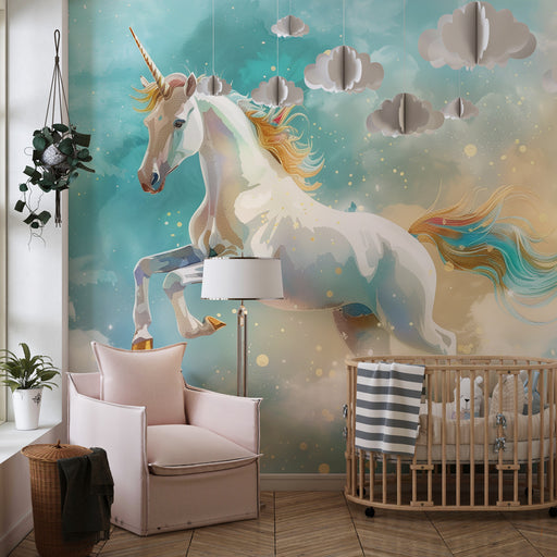 KidsWallTransformez l'espace de votre enfant avec ce papier peint pour chambre d'enfant aux motifs enchanteurs. Une licorne joyeuse s'élève dans un ciel bl...