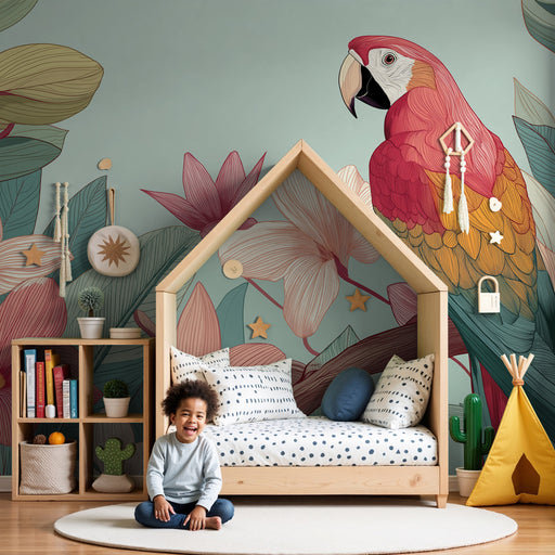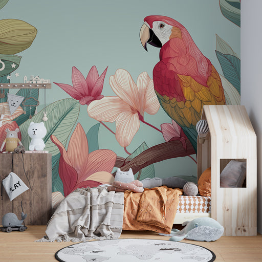KidsWallBienvenue dans un univers enchanteur avec ce papier peint pour enfants, mettant en vedette un majestueux perroquet aux teintes vibrantes, blotti pa...