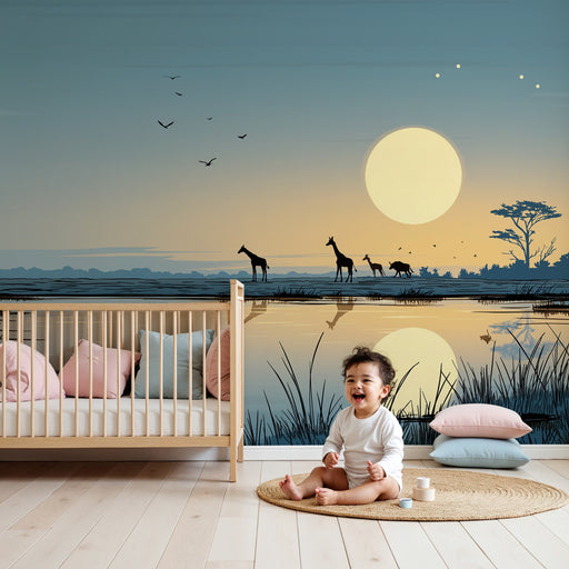 KidsWallEmportez votre enfant dans un voyage au cœur de la savane avec ce papier peint pour enfants captivant. Une majestueuse girafe, silhouette élancée, ...