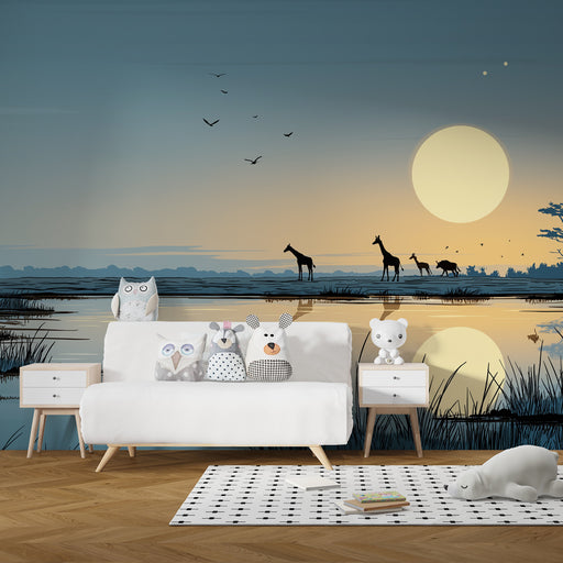 KidsWallTransformez la chambre de votre enfant avec ce papier peint enchanteur représentant une girafe majestueuse se tenant au bord de l'eau sous un ciel ...