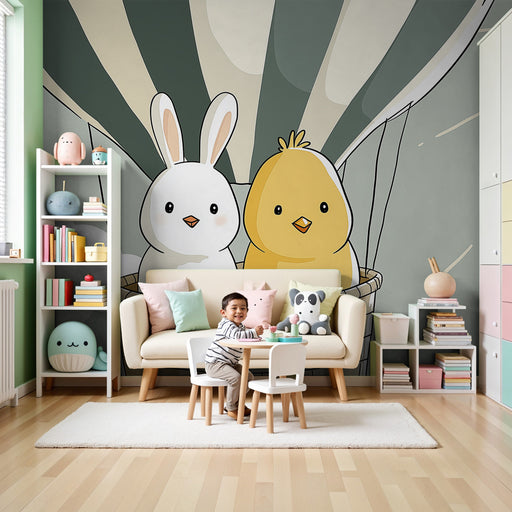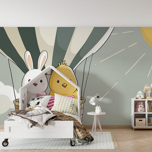 Papier peint chambre bébé | Ballon dirigeable avec un lapin et un poussin