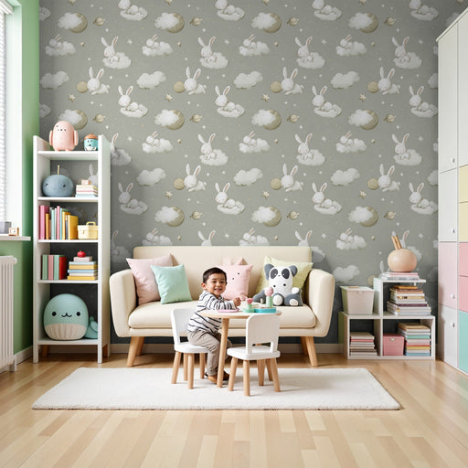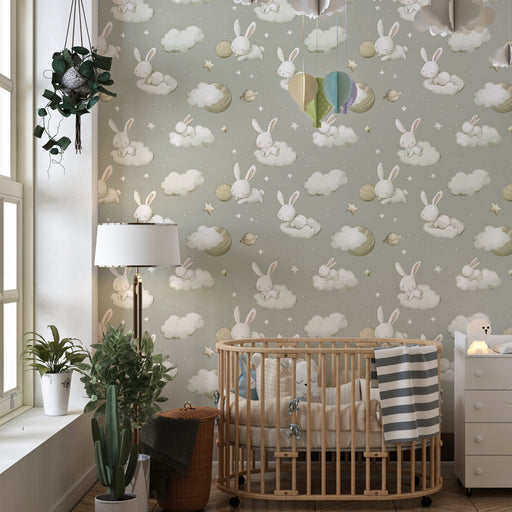 KidsWallPlongez dans un monde de douceur et de rêve avec ce papier peint pour chambre de bébé, mettant en scène un adorable lapin blotti sur un nuage moell...