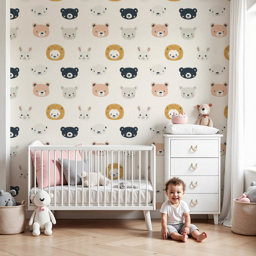 Transformez la chambre de votre petit avec ce papier peint charmant décoré de mignons visages d'animaux. Chaque motif, allant des oursons aux tigre...