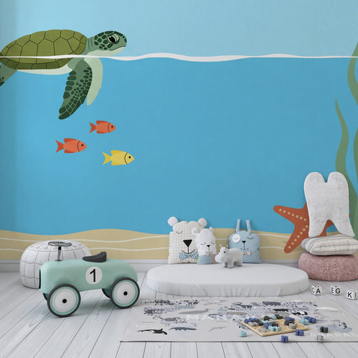 KidsWallPlongez dans un univers aquatique enchanteur avec ce papier peint pour chambre de bébé, où une tortue majestueuse nage paisiblement parmi des poiss...