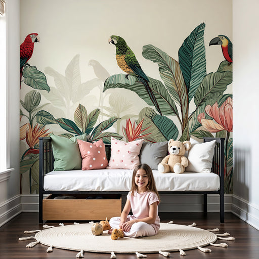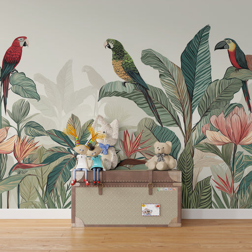 Kinderzimmer Tapete | Tropisches Paradies mit bunten Papageien