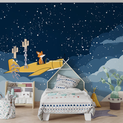 Nastupte na mimořádnou cestu s tímto tapetou pro děti, která zobrazuje neohroženého lišáka za řízením žlutého letadla, létajícího nad hvězdnou oblo...