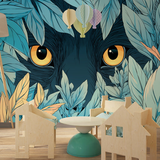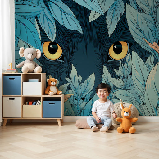 Přidejte do dětského pokoje špetku dobrodružství a tajemství s tímto dětským tapetou zobrazujícím poutavé oči zvířete skrytého za bujným listím. Bu...