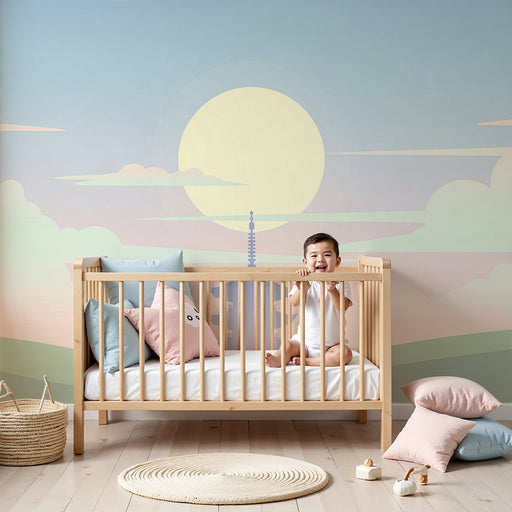 Zobrazit celý detailTapeta dětského pokoje | Pastelové hory a slunce