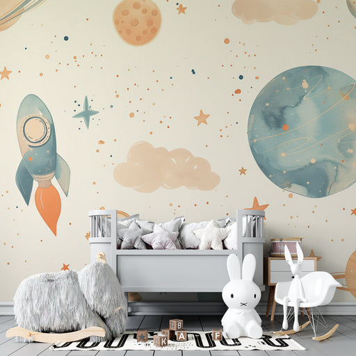 Tapeta dětského pokoje | Rakety, planety a astronauti v pastelových tónech