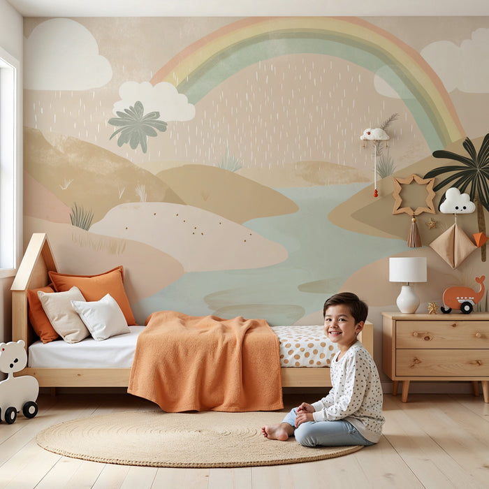 Nabídněte svému dítěti klidný a poetický svět s tímto papírovým tapetou pro dětský pokoj, který láká k úniku. Představte si pastelový duhový oblak, který osvětluje pouštní krajinu, kde jemný a něžný déšť osvěžuje okolní přírodu. Kouzelná výzdoba, která proměňuje pokoj v oázu klidu a dobrodružství.