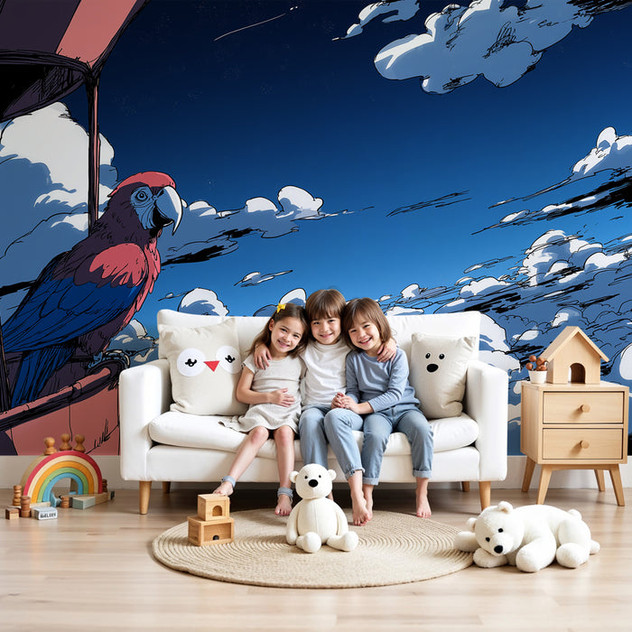 Živé barvy papouška harmonicky kontrastují s modrou oblohou, vytvářejíce radostnou a inspirativní atmosféru. Každý detail, od zářivých per po bavlněné obláčky, přidává do pokoje nádech fantazie a lehkosti.