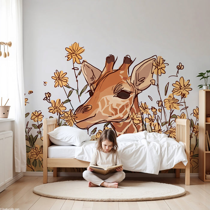 Přineste do dětského pokoje přírodní a jemný dotek s tímto tapetou pro děti, která zobrazuje žirafu obklopenou zlatými květy. Tento poutavý motiv vytváří klidnou a přívětivou atmosféru, ideální pro probuzení fantazie malých cestovatelů.