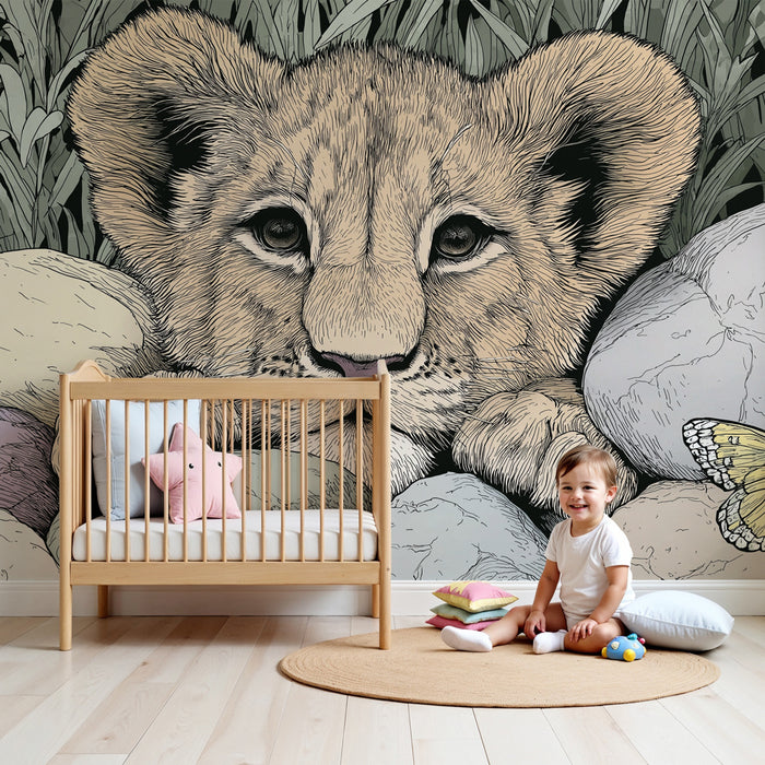 Dětská tapeta | Zvědavý lvíče a barevní motýli