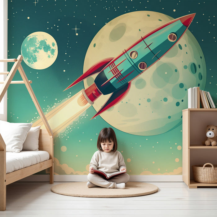 Dětská tapeta | Retro raketa v plném startu směrem k hvězdnému měsíci