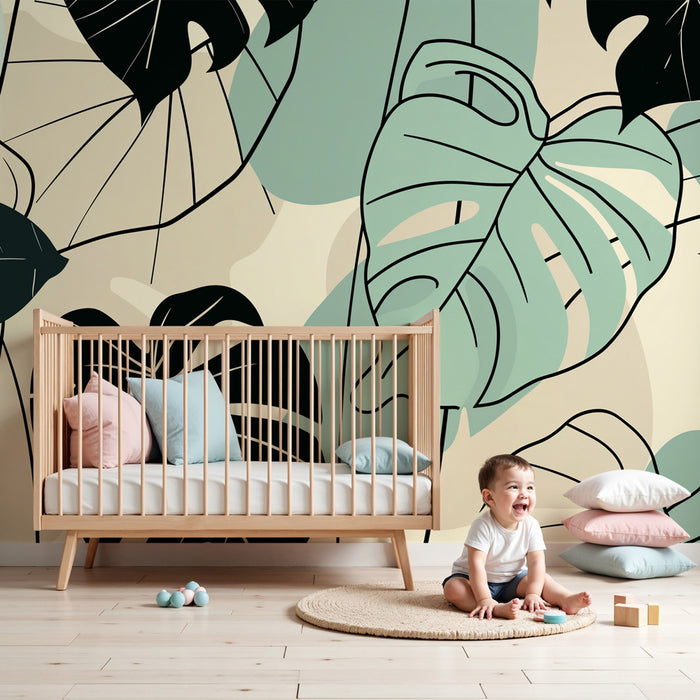 Proměňte pokoj vašeho dítěte v opravdový tropický útočiště s tímto tapetou pro děti s motivy stylizovaných listů. Harmonie jemných barev jako máta zelená a béžová, kombinovaná s grafickými liniemi, vytváří uklidňující a moderní atmosféru.