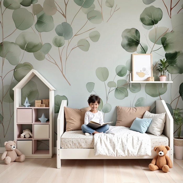 Představte si lehký vánek, který prochází jemným listím a přináší pocit svěžesti a klidu do dětského pokoje. Tento tapet pro dětský pokoj zachycuje uklidňující krásu přírody s jemně akvarelovými eukalyptovými listy, vytvářející jemnou a pohodlnou atmosféru.