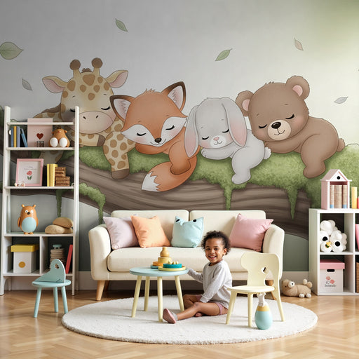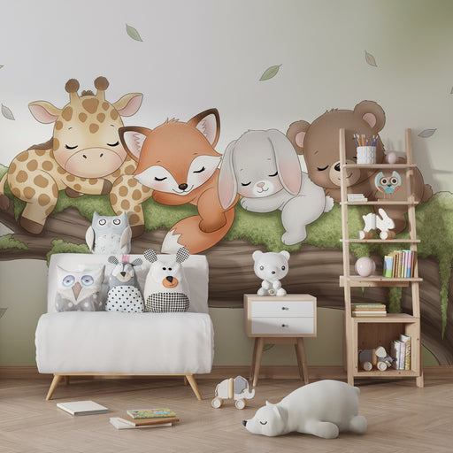 KidsWallPonořte se do světa něhy s tímto tapetou pro děti, zobrazující roztomilá zvířátka spící na větvi. Jižník, liška, králík a medvěd, všichni roztomil...