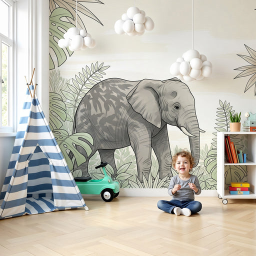 KidsWallPonořte se do fascinujícího světa džungle s tímto dětským tapetou, která zobrazuje majestátního slona pohybujícího se uprostřed bujné vegetace. Jeh...