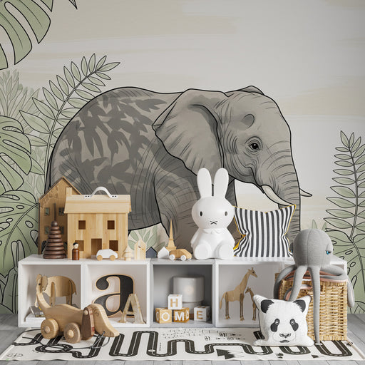 KidsWallProměňte pokoj vašeho dítěte v klidné útočiště s tímto tapetou znázorňující majestátního slona, obklopeného jemnými listy. Detailní rysy slona přin...