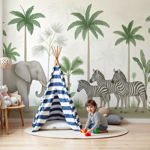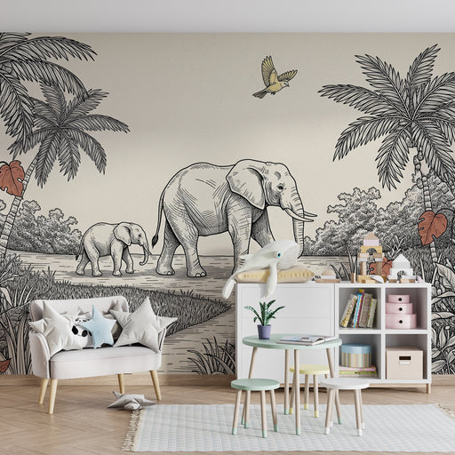 KidsWallProměňte pokoj svého dítěte v cestu do srdce přírody s tímto papírovým tapetem pro děti, který zobrazuje klidnou džunglovou scénu. Dva sloni, dospě...