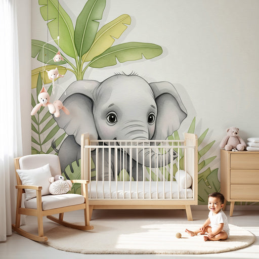 Zobrazit celý detailDětská tapeta | Dětský slon a tropické listí