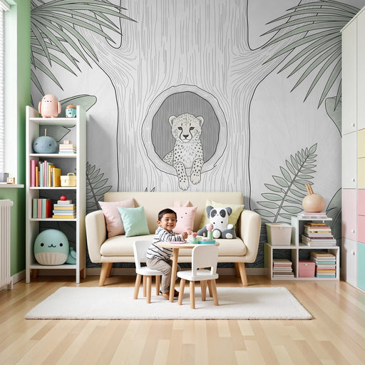 KidsWallProměňte pokoj svého dítěte v divoký úkryt s tímto papírovým tapetem pro děti, který zobrazuje roztomilého mláděte leoparda usazeného na stromě. Ob...