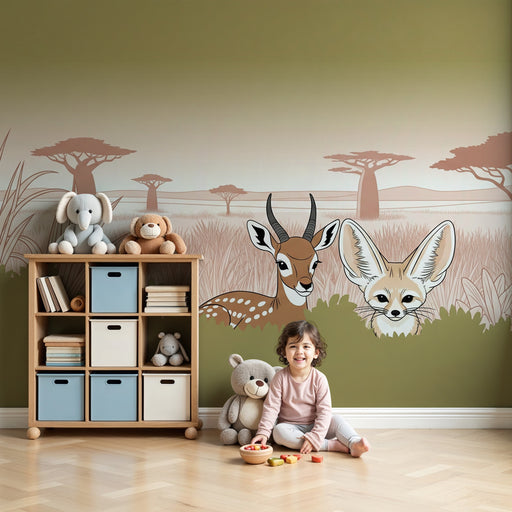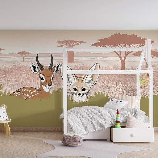 KidsWallProměňte pokoj svého dítěte v pravý safari s tímto tapetou pro děti, která zobrazuje klidnou scénu savany. Elegantní jelen a Zvědavý feneček se skr...