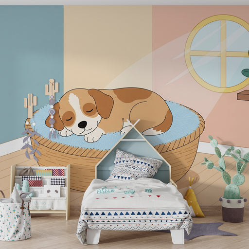 KidsWallPonořte se do jemného a přívětivého světa s tímto papírovým tapetou pro děti, který zobrazuje roztomilé štěně spící ve svém košíku. Pastelové odst...