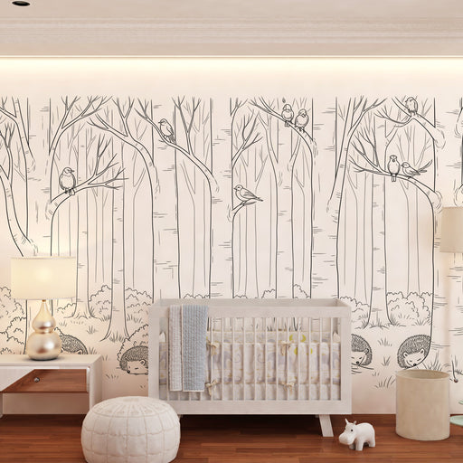 Zobrazit celý detailDětská pokojová tapeta | Odpočinek v lese s ježky a ptáky