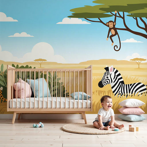 KidsWallPonořte se do světa dobrodružství s tímto tapetou do dětského pokoje, která zobrazuje radostnou safari scénu. Uprostřed jemné savany se skrývá zvě...