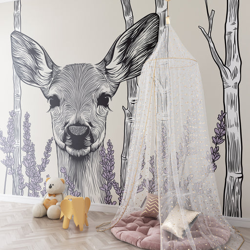 Zobrazit celý detailDětská pokojová tapeta | Jemný jelen obklopený levandulí