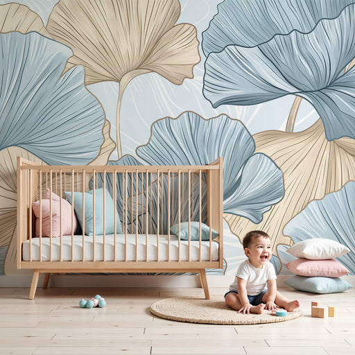 Zobrazit celý detailDětská pokojová tapeta | Jemné listy jinanu a uklidňující odstíny