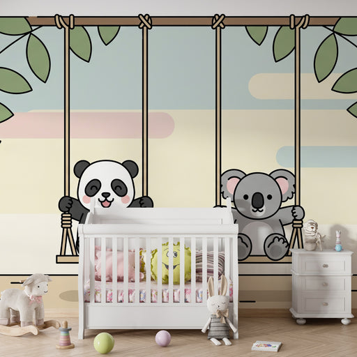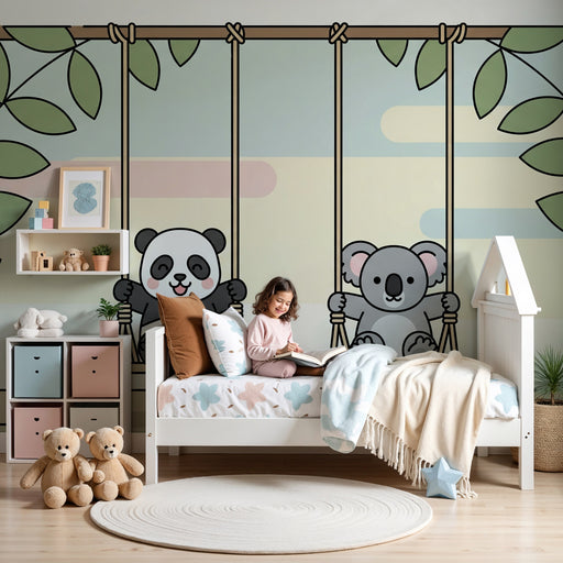 Zobrazit celý detailTapeta dětského pokoje | Pandy a koaly na houpačkách