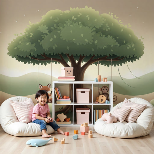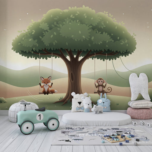 KidsWallVytvořte hravý a radostný svět v dětském pokoji s tímto papírovým tapetou pro děti, která zobrazuje lišku a opici hrající na houpačkách. Ve stínu v...