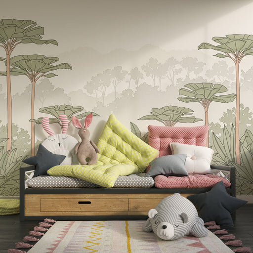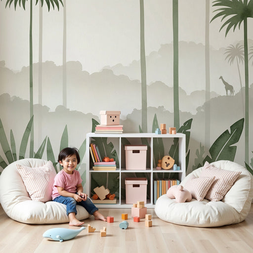 KidsWallProměňte pokoj vašeho dítěte v opravdový útočiště klidu s tímto tapetou pro děti inspirovanou džunglí. Majestátní palmy vystupují nad hojnou vegeta...
