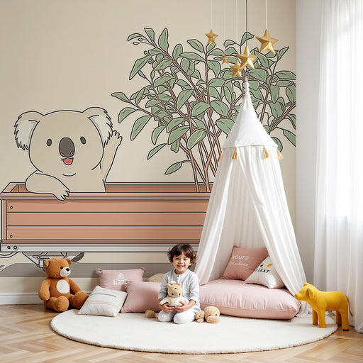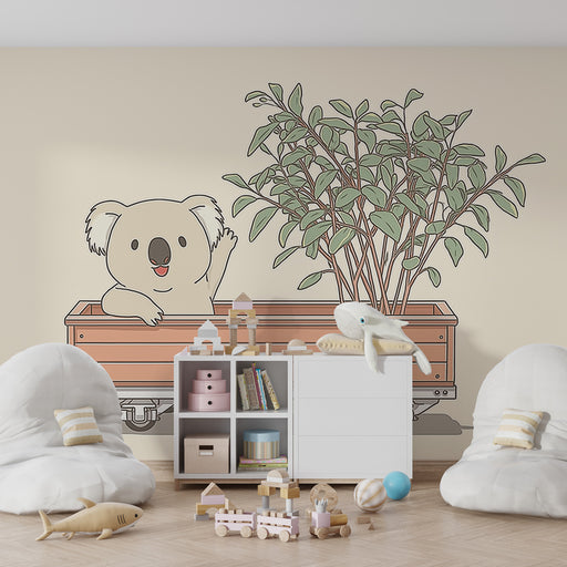 KidsWallPřineste do dětského pokoje něhu a přírodu s tímto tapetou pro děti, která zobrazuje roztomilého koalu hrajícího si v dřevěném vozíku obklopeném kr...
