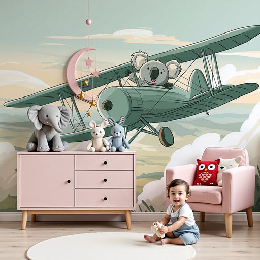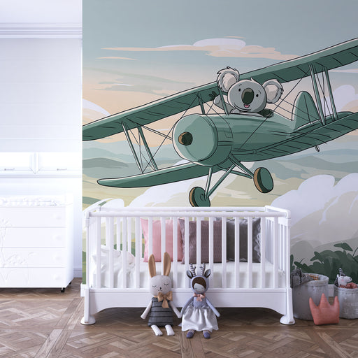 KidsWallNastupte na letecké dobrodružství v dětském pokoji s tímto papírovým tapetou pro děti, který zobrazuje roztomilého koalu pilotujícího starý letoun....