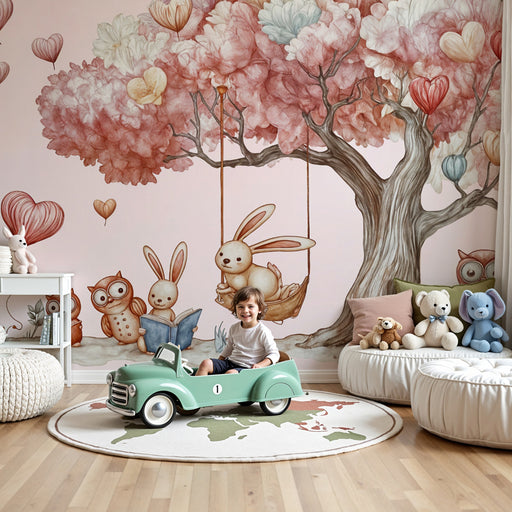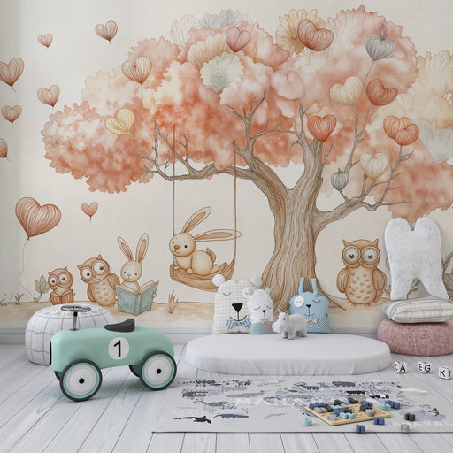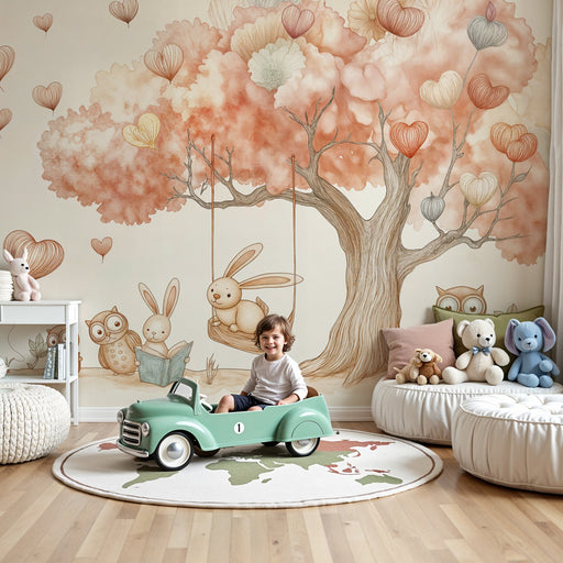 KidsWallProměňte pokoj svých dětí ve svět snů s naší dětskou tapetou znázorňující pohádkový strom plný roztomilých zvířat a srdcovitých horkovzdušných baló...