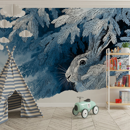 Zobrazit celý detailTapeta dětského pokoje | Skrytý králík pod zasněženými větvemi