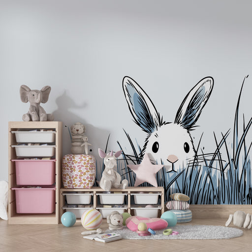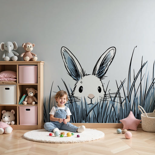 KidsWallPřidejte do dětského pokoje něžný dotek s tímto papírovým tapetou pro děti, která zobrazuje roztomilého malého zajíce skrytého v jemně modré trávě....