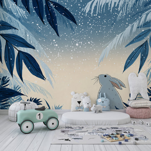 KidsWallObjavte kúzelný a divoký svet prírody s týmto tapetou pre deti, ktorá zobrazuje zvedavého králika skrytého pod hustým lístím. Odtiene modrej a biel...