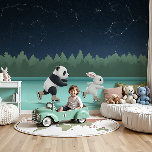 KidsWallNastupte na kouzelné dobrodružství v dětském pokoji s tímto papírovým tapetou pro děti, která zobrazuje pandu a zajíce, kteří radostně bruslí na tř...