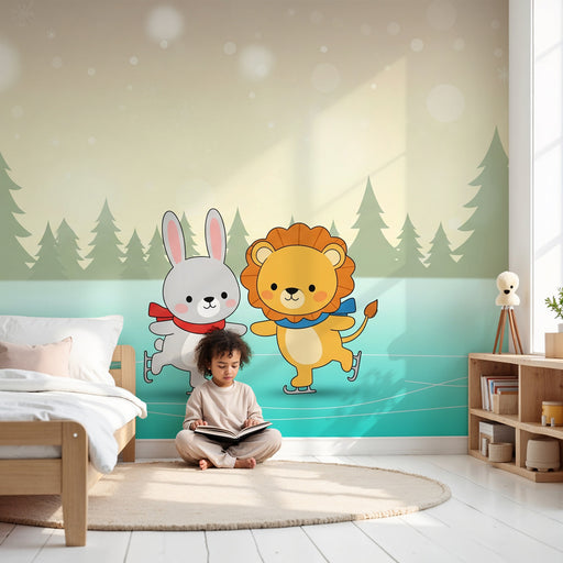 KidsWallPonořte se do kouzelné zimní atmosféry s tímto tapetou pro dětský pokoj, která zobrazuje roztomilý pár bruslařů. Šedý králík a zlatý lev, oba oble...