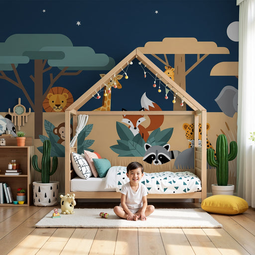 Kids room wallpaper | Jungle animals under a starry sky playing hide and seek