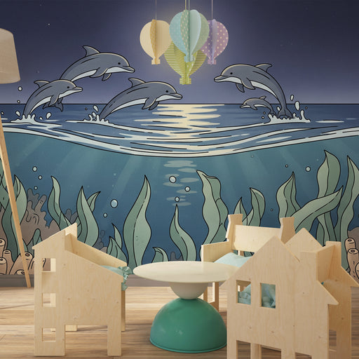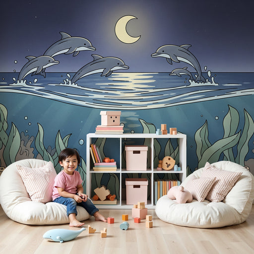 KidsWallPonořte své dítě do kouzelného mořského světa s tímto tapetou pro děti, která zobrazuje delfíny skáčící s grácií pod měsícem. Mořské tvory přidávaj...