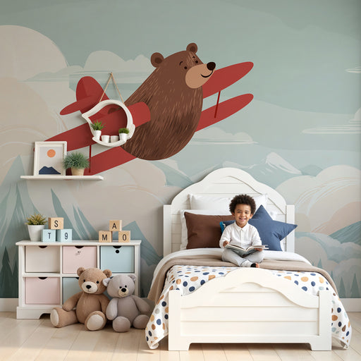 KidsWallNastupte na vzdušnou dobrodružnou cestu s tímto poutavým dětským tapetou, která zobrazuje usmívajícího se medvěda za řízením červeného letadla. Pře...