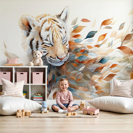 KidsWallTransformujte dětský pokoj svého dítěte s tímto poutavým dětským tapetou, která zobrazuje tygra s klidným pohledem a plující listy v teplých tónech...